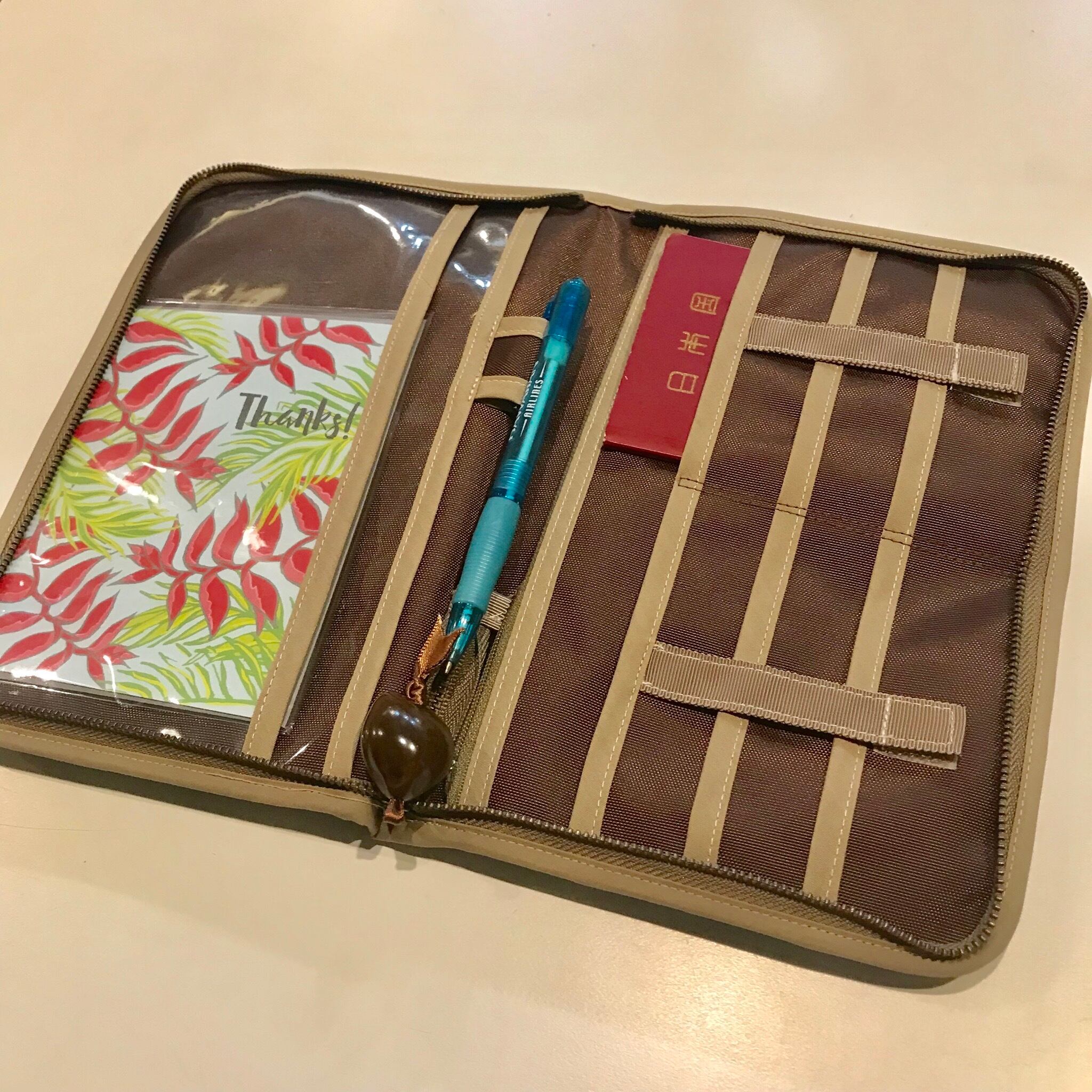 ビニールポケットには、搭乗券や二つ折のA4用紙がちょうど収まるのでトラベルポーチとしても便利です。