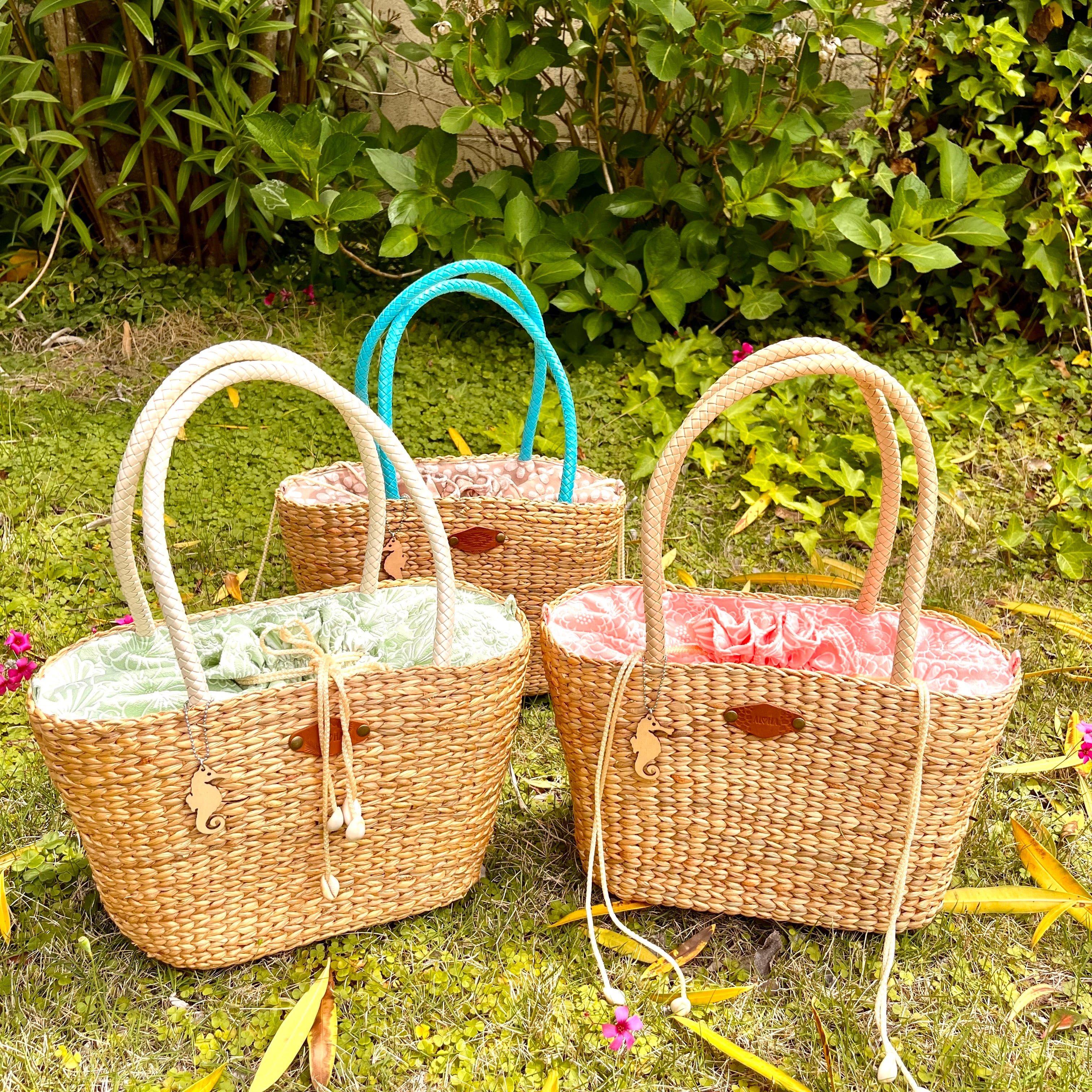 レザーのタグやストリング先端のシェルやタツノオトシゴのチャームなどこだわりが詰まったおしゃれで使いやすいカゴトート!